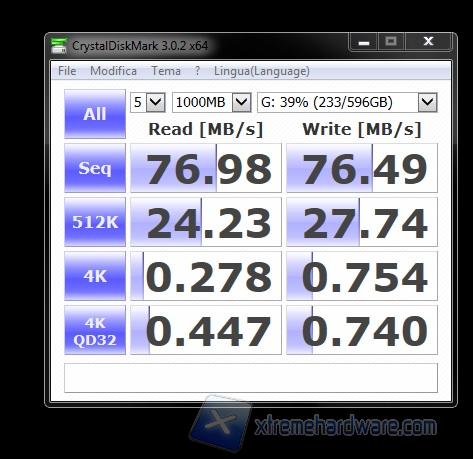 I valori fatti segnare da questo benchmark sia in lettura sia in scrittura mettono in evidenzia le buone prestazioni di questa unità esterna che all'interno di essa monta un Hard Disk da 3.5". Il Chipset Z77 ovviamente offre ottime prestazioni sul comparto USB 3.0, come di consueto.