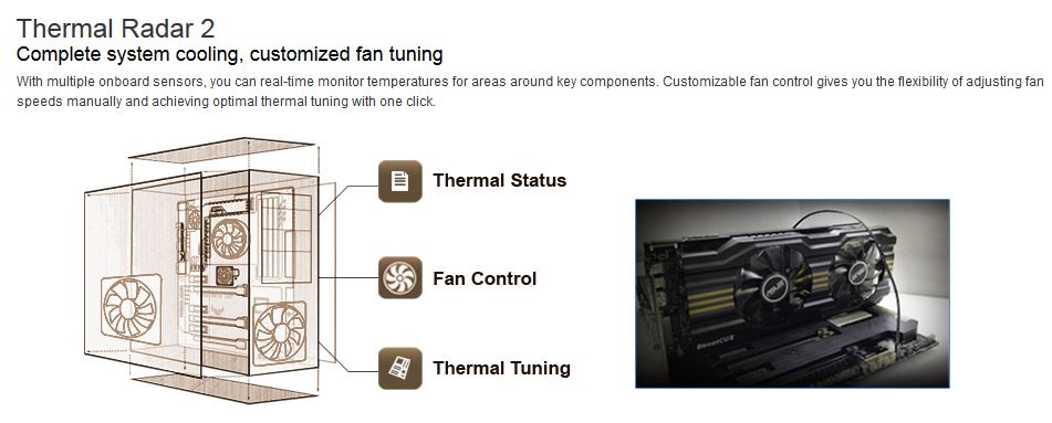 Quello che accompagna la Gryphon Z87, come da tradizione per la linea TUF, è un ricco e completo sistema di sensori che restituendo in tempo reale le temperature raccolte in punti strategici di tutto il PCB ci permette di tarare e controllare alla perfezione il regime di rotazione delle ventole, grazie anche all’aiuto del software dedicato.