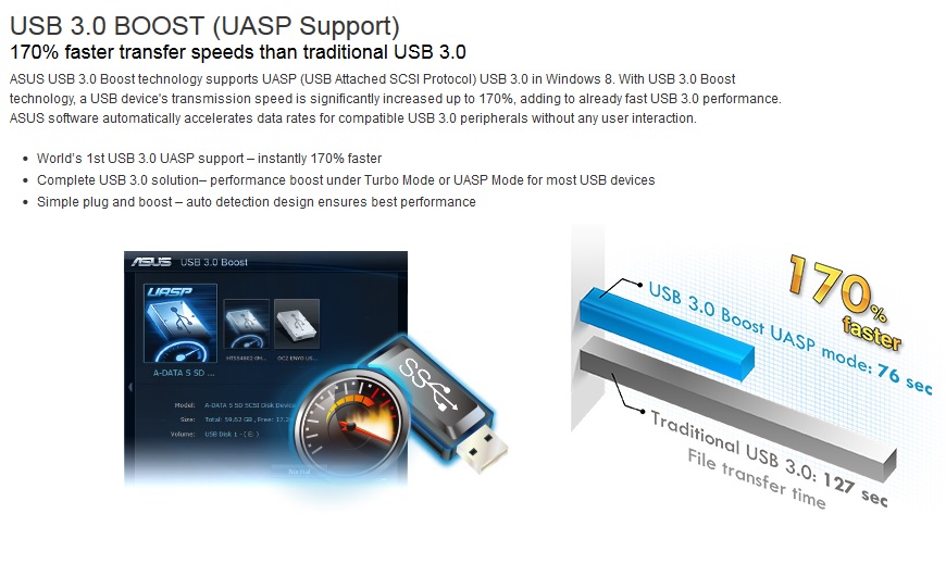 Il supporto alla tecnologia UASP consente d’incrementare fino al 170% in modo del tutto automatico e trasparente per l’utente la velocità di trasferimento dei dispositivi compatibili e connessi alle porte USB 3.0.