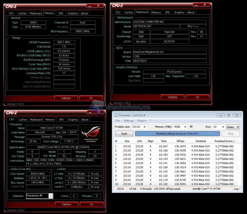 Usufruendo di un sistema di raffreddamento a liquido siamo riusciti ad overcloccare il processore ed a rimanere stabile sotto LINX fino alla frequenza di 4500 MHz. Noto tool di stress, LINX si avvale delle librerie Linpack della Intel ed è in grado di portare il carico su tutti i core della CPU prossimo al 100 %.