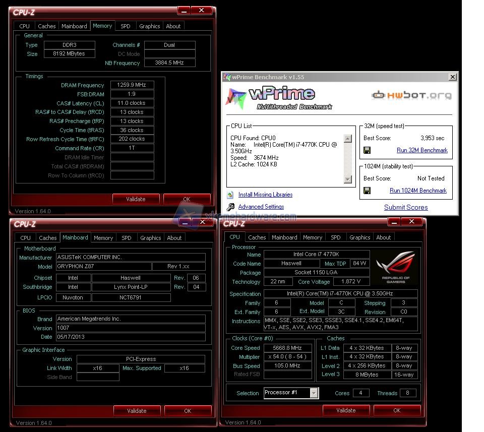 Altro test particolarmente gravoso in quanto sfrutta tutti i threads della CPU è il benchmark Wprime di cui è disponibile sia il test 32 che 1024. In sintesi il benchmark calcola la radice quadrata dei primi 32 milioni di numeri interi e dei primi 1024 milioni di numeri interi utilizzando l’ALU del processore, simile al benchmark SuperPi ma con un impatto in termini di carico e calore sviluppato molto maggiore. Utilizzando un sistema di dissipazione ad azoto liquido siamo riusciti a spingerci a quasi 5800 MHz, una frequenza ragguardevole per un test multithreaded e per una scheda madre che non è di certo stata progettata per l’overclock estremo. La ASUS Gryphon Z87 ha sopportato senza grossi problemi una lunga sessione di overclock sub-zero, a dimostrazione della qualità delle componenti utilizzate. I test effettuati confermano le nostre aspettative: la Gryphon è una scheda madre molto robusta, perfetta per chi vuole effettuare un overclock daily use. La scheda non è stata progettata per l’overclock estremo, ma avendola testata sotto azoto si è comportata più che onorevolmente, garantendo tensioni molto stabili e grazie al BIOS ASUS, un buon overclock è molto semplice da ottenere. Ovviamente non ha quegli accorgimenti presenti nelle schede di fascia più alta come la serie ROG, che presentano punti di lettura delle tensioni e profili pre-memorizzati per il settaggio di determinati chip di memoria. La scheda si è comportata molto bene nello sfruttare la memoria, grazie al vantaggio del controller integrato in Haswell che ha fatto notevoli passi avanti. Abbiamo notato anche l’assenza del display a doppio digit per la diagnostica in fase di boot nonché i pulsanti di accensione e di reset, preziosi per chi utilizza la motherboard a banco.