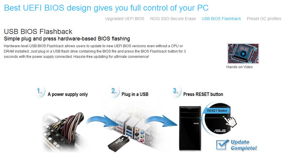 L’innovativo sistema USB BIOS Flashback è in grado di operare anche senza CPU e RAM. Basta solo collegare la Memory Key USB e premere il pulsante del BIOS Flashback per 3 secondi.