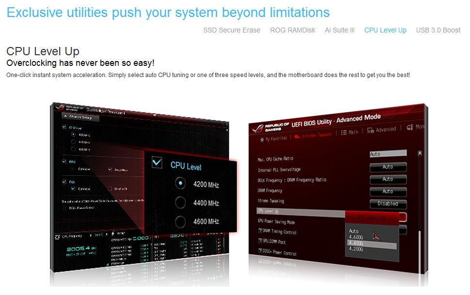 Per i meno esperti nelle fasi di overclock o semplicemente per migliorare rapidamente in un click le prestazioni globali, ASUS ha realizzato il Dual Intelligent Processor 4 che automaticamente ottimizza i parametri di funzionamento legati al consumo e rumore del sistema in relazione alla potenza richiesta, permettendo all’utente di scegliere tra 3 scenari diversi di utilizzo.