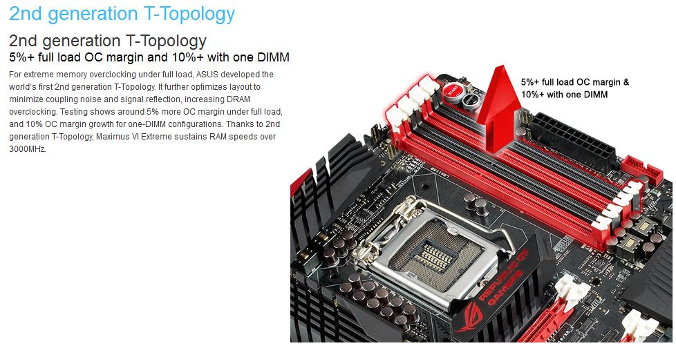 Giunto alla 2° generazione, il sistema T-Topology aumenta l’efficienza e diminuisce il rumore dei segnali dedicati ai moduli RAM, consentendo overclock delle memorie più spinti. Test dimostrano benefici fino al +5% con il sistema a pieno carico e +10% con un unico banco di RAM.
