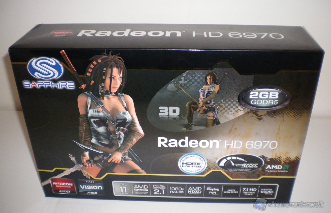 La confezione è rappresentata da una grossa scatola con uno sfondo di colore scuro; il frontale vede primeggiare l'immagine di un personaggio femminile, una sorta di guerriera che ci vuol rappresentare la forza di questa scheda video, come da tradizione Sapphire. Tra i loghi, oltre a quello Sapphire, spicca in bella mostra la dicitura 2GB GDDR5, che appunto lascia trasparire la notevole quantità di VRAM on board. Più in basso abbiamo il modello descritto, ossia Radeon HD 6970, mentre immediatamente sotto c'è un adesivo con la dicitura HDMI High Speed, il software TriXX ed il logo AMD. Nella parte bassa invece sono descritte le principali caratteristiche tecniche come il supporto alle Full DirectX 11 di Microsoft, la tecnologia AMD Eyefinity multi-display, PCI-Express 2.1, 1080p Full HD, tecnologia AMD HD3D, nuova porta Display Port vers. 1.2, audio 7.1 HD surround sound, e memorie GDDR5.