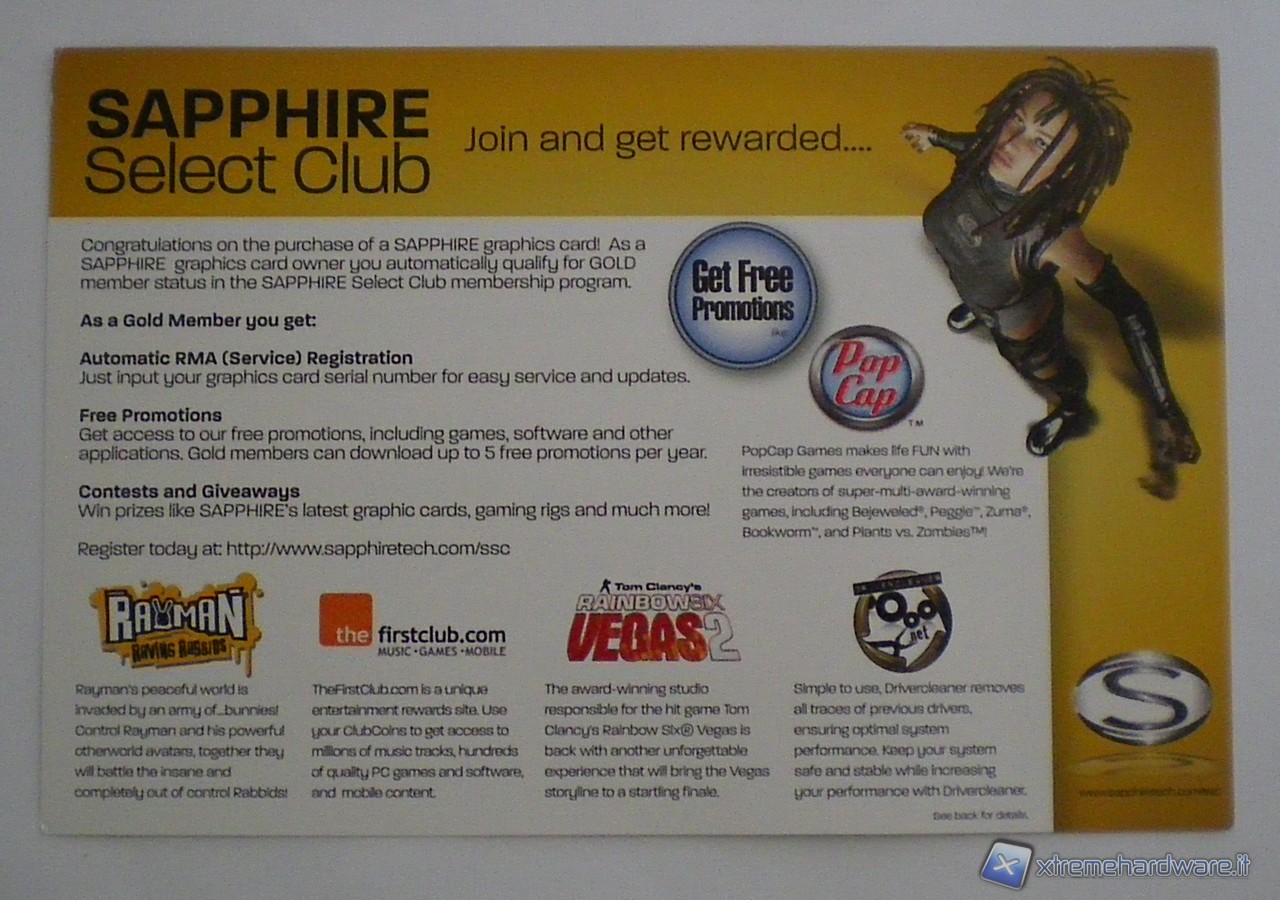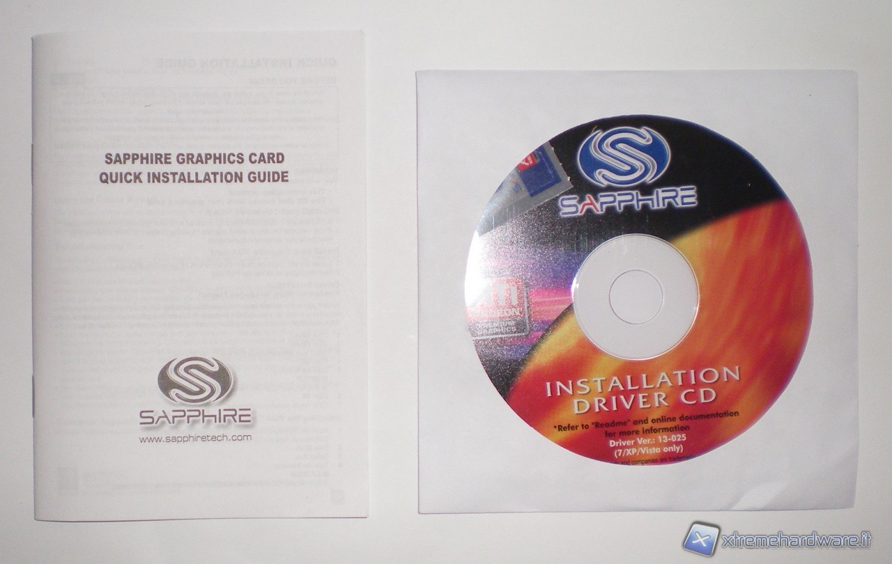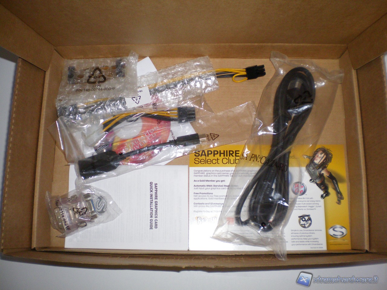 Troviamo inoltre un bridge per il CrossFire utile nel caso in cui si vogliano installare due e più schede video. Adattatore da DVI a VGA, piccolo cavo che converte da mini-display port ad un normale display-port, ed un ulteriore cavo da 1,5 mt che prolunga la connessione HDMI. Completano il tutto guida rapida all'installazione, DVD con driver e software e coupon di invito alla registrazione al Sapphire Select Club.
