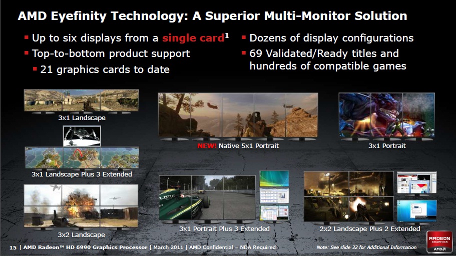 La scheda si presta particolarmente a configurazioni multi monitor EyeFinity con un'estrema flessibilità. In ogni confezione di HD 6990 sono presenti 3 adattatori: 1 x MiniDP to SL-DVI passive, 1 x MiniDP to SL-DVI active, 1 x MiniDP to HDMI passive. Le configuazione possibili in modalità Eyefinity sono davvero tantissime; in queste slide sono riassunte quelle possibili: