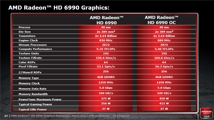 Il doppio chip grafico Cayman che equipaggia ogni Radeon HD 6990 è dotato di ben 24 SIMD, ciascuno è costituito da 16 thread processor VLIW-4. Ogni singolo chip grafico è dotata di 1536 Stream Processor, mentre le TMU sono 96, in rapporto di 4 per ogni SIMD, il numero di ROPs è di 32. Ad ogni gpu sono associati 2GB di memoria di tipo GDDR5, che permetterà di giocare senza alcun problema anche ad elevate risoluzioni in configurazione multi monitor. Il processo produttivo è quello ormai collaudato  a 40nm, mentre ogni chip grafico ha dimensione del Die di 389mm2 ed è dotato di 2.64 miliardi di transistor. Per la Radeon HD 6990 abbiamo una capacità computazionale di ben 5.10 TFLOPS (830 MHZ) o di 5.40 TFLOPS (880 MHz), mentre il Texture FillRate è di 159.4 Gtex/s (830 MHz) o di 169.0 Gtex/s (880 MHz). Il Pixel FillRate è di 53.1 Gpix/s (830 MHz) o di 56.3 Gpix/s (880 MHz). Ogni gpu ha un controller interno per le memorie a 256bit, che in abbinamento a memorie di tipo GDDR5 permette di ottenere una banda passante verso la memoria di ben 320 GB/s. I consumi si assestano su ottimi livelli, AMD infatti dichiara appena 37 W in idle, 375W come massimo assorbimento con il selettore bios in posizione standard (pos.2), mentre con un uso tipico in game siamo sui 350 W. Spostando il selettore bios alla posizione più spinta, i consumi crescono ed arriviamo a 450 W come massimo assorbimento e 415 W tipici in condizioni di gaming. La scheda necessita di doppio connettore ad 8pin PCI-E da parte dell'alimentatore.