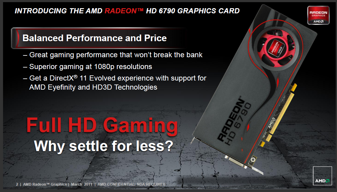 A tal proposito AMD propone la Radeon HD 6790 serve proprio a colmare questa fascia prestazionale, che in precedenza risultava non coperta. Questo segmento è chiamato Performance Market, ed è dedicato a tutti quegli utenti che cercano un prodotto in grado di garantire un rapporto prezzo/prestazioni elevato.