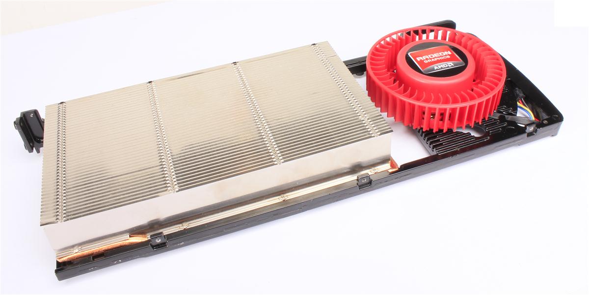 La scheda prevede una nuova disposizione nella zona posteriore: infatti adesso la griglia di uscita dell'aria calda è di tipo full, mentre nella parte inferiore troviamo le uscite video. In questo modo il raffreddamento è garantito da un maggiore flusso in uscita. La ventola, sempre di tipo tangenziale, ha un nuovo disegno, maggior diametro complessivo e pale di aereazione completamente ridisegnate: questo assicura un più alto CFM (flusso di aria), maggior raffreddamento ed un ulteriore riduzione del rumore emesso durante il funzionamento. Troviamo, come di consetudine, un selettore di fianco alla scheda che ci permette di selezionare il bios (dual bios toggle switch), che in posizione 2 usa le impostazioni di default di fabbrica, mentre in posizione 1 sblocca il bios e ci permette di effettuare varie modifiche, come overvolt ed altre operazioni molto ben conosciute agli appassionati di overclock. Il sistema di raffreddamento ha avuto ancora un ulteriore evoluzione: questa volta infatti il corpo dissipante è dotato di ben 6 heat-pipe con tecnologia Vapor Chamber.