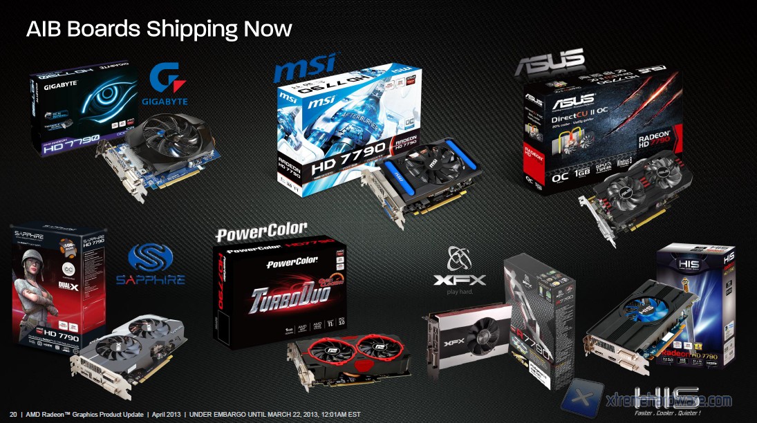 I partner AIB di AMD presenteranno alcuni modelli, sopratutto custom con dissipatori e/o frequenze diverse dal modello reference AMD. Dall'immagine sopra possiamo osservare come già sono previsti alcuni modelli da parte dei più noti produttori di schede grafiche come ASUS, Gigabyte, Sapphire, MSI, XFX, PowerColor, VTX3D e HIS. Questa sarà un'ulteriore possibilità da parte del consumatore di poter effettuare una scelta ancora più consapevole e conveniente.