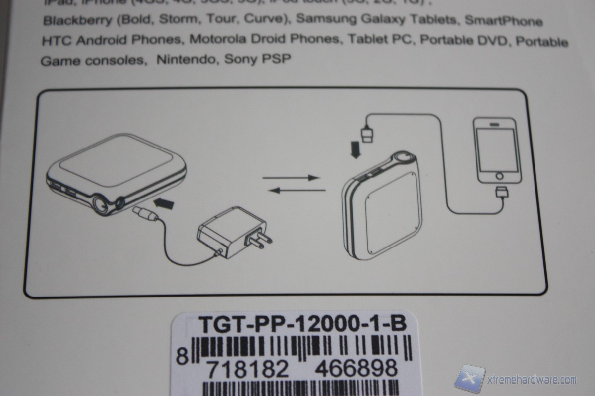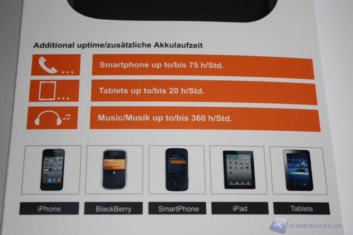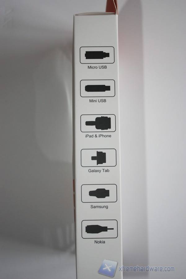 Ai lati della confezione sono riportati da una parte i vari connettori presenti nella confezione come quello per iPhone/iPad, i tab della Samsung, Nokia, Samsung e quelli universali come il Mini-USB e il Micro-USB di cui praticamente ogni smartphone recente ne è dotato. mentre sull'altro lato sono riportate alcune caratteristiche principali del PowerPack come la potenza di ben 12000mAh, l'adozione di circuteria dalle ridotte dimensioni, il fattore di forma del tutto portabile, le varie protezioni di cui questo battery pack è dotato ed infine la garanzia del prodotto.