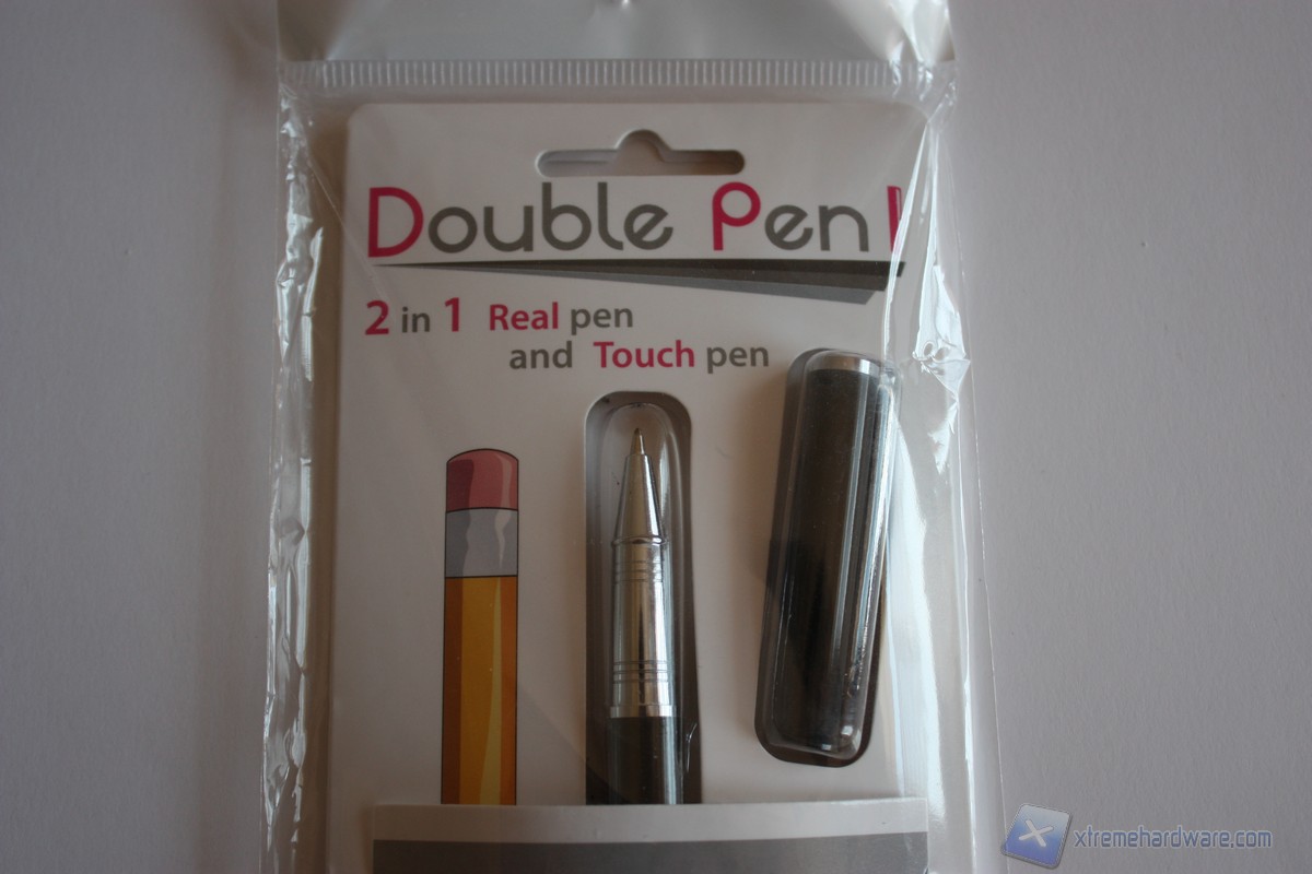 La confezione della Double Pen si presenta con una semplice bustina di plastica trasparente, nella quale è presente un cartoncino che mantiene ben saldo all'interno il prodotto. Nella parte frontale della confezione in alto, troviamo il nome del prodotto e poco più sotto la descrizione delle funzionalità. Centralmente possiamo notare la punta della penna ed a fianco il cappuccio della stessa. A fianco di essi è presente un disegno di un matita che ne indica la caratteristica principale del prodotto. Poco più sotto notiamo un apertura circolare che mostra l'estremità in gomma della penna. Infine, nell'angolo in basso a destra, è presente il logo del produttore.