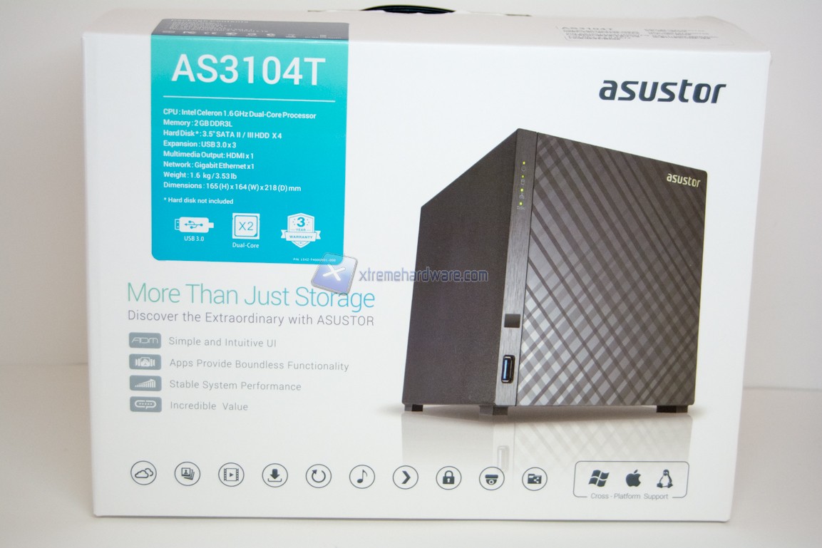 La confezione dell’Asustor AS3104T ricalca le caratteristiche alla quale l’azienda ci ha abituato. Siamo dunque di fronte ad una scatola di color bianco ricca di informazioni.