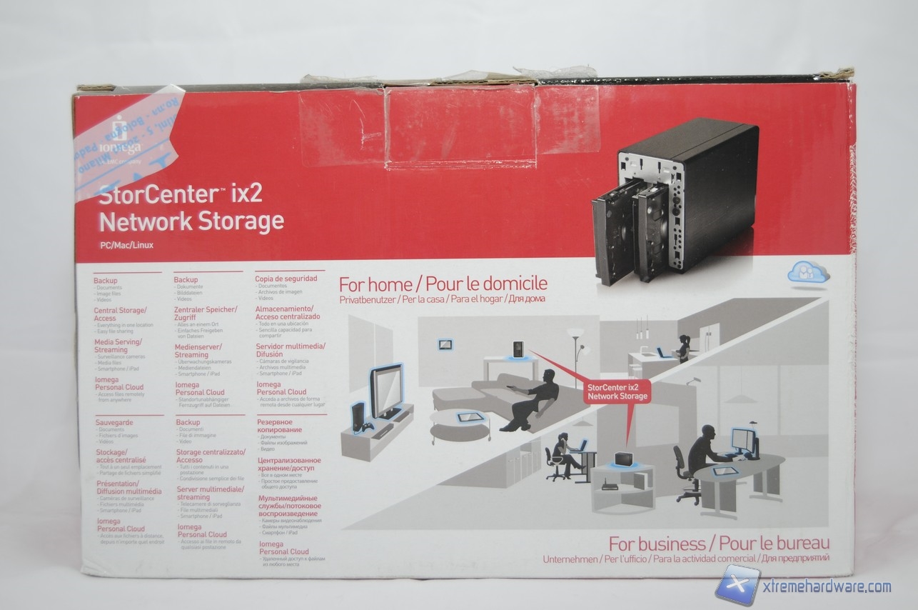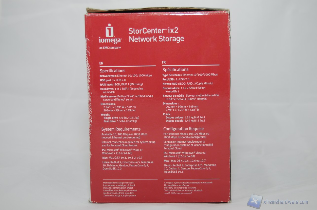 I lati destro e sinistro riportano informazioni riguardanti il prodotto; a sinistra troviamo infatti un'immagine dello StorCenter e un avviso multilingua che ci avverte della facilità di configurazione, mentre a destra troviamo in inglese e francese tutte le specifiche tecniche.