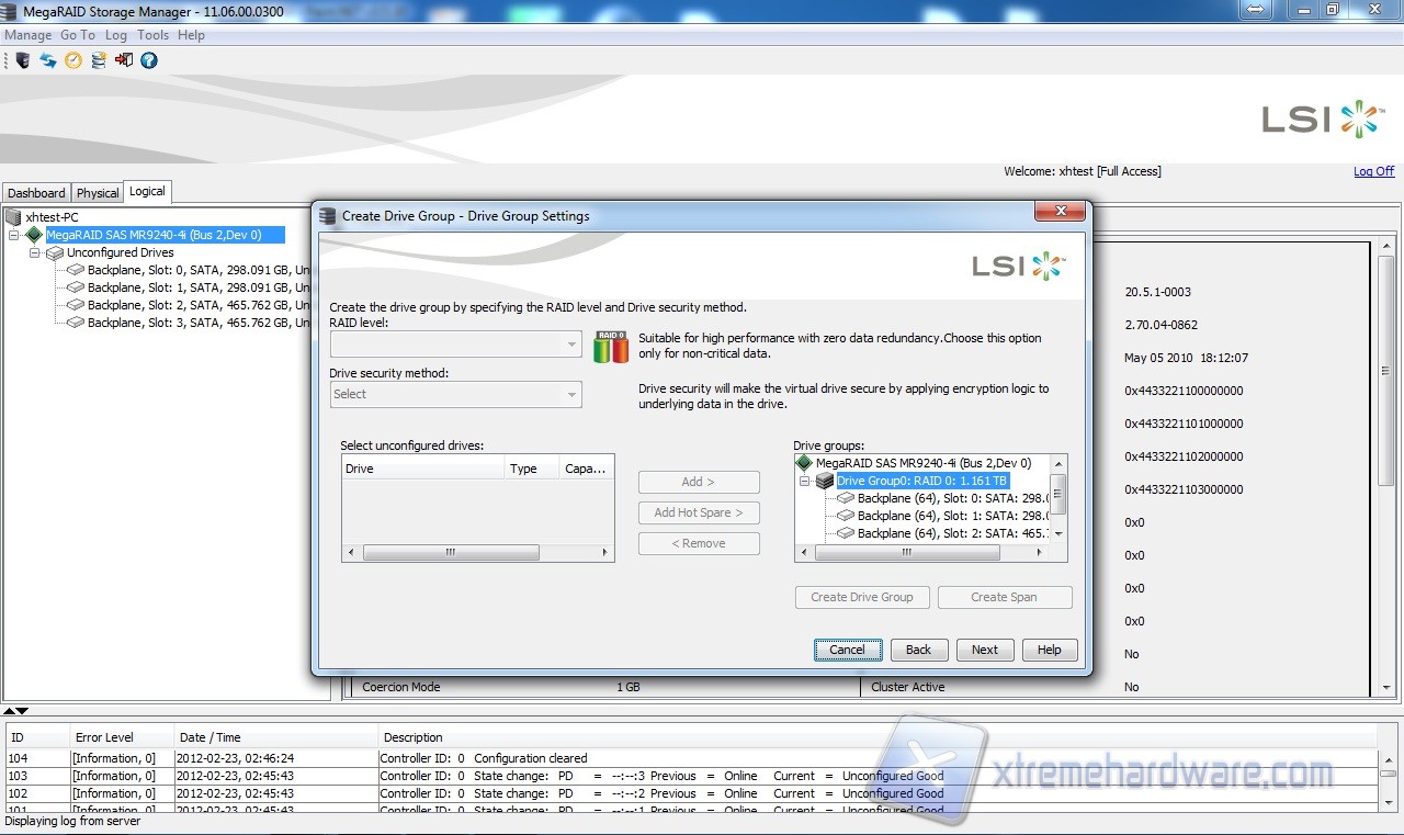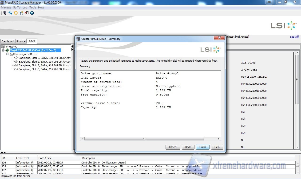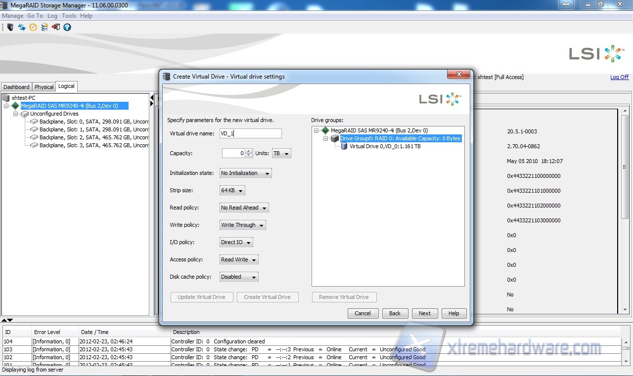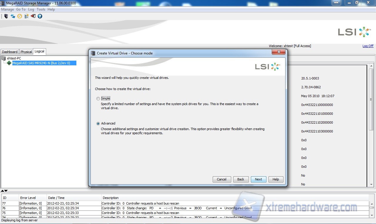 Una volta entrati in Windows possiamo utilizzare il programma MegaRAID Storage Manager per creare la nostra unità virtuale in base alle nostre esigenze, il software ci darà la possibilità di scegliere tra le impostazioni semplici e quelle avanzate, nel secondo verranno visualizzati, in un apposito menù, i drive a disposizione che potremo aggiungere alla nostra unità virtuale in modo da creare una configurazione RAID 0, 1, 5, 10 o 50.