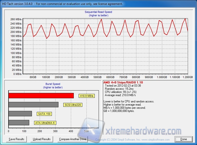 HD Tach è un programma ormai poco usato data la sua parziale negligenza verso i sistemi operativi di ultima generazione, nonostante ciò si dimostra ancora utile per il nostro scopo, ovvero quello di determinare la velocità in lettura sequenziale della nostra configurazione.