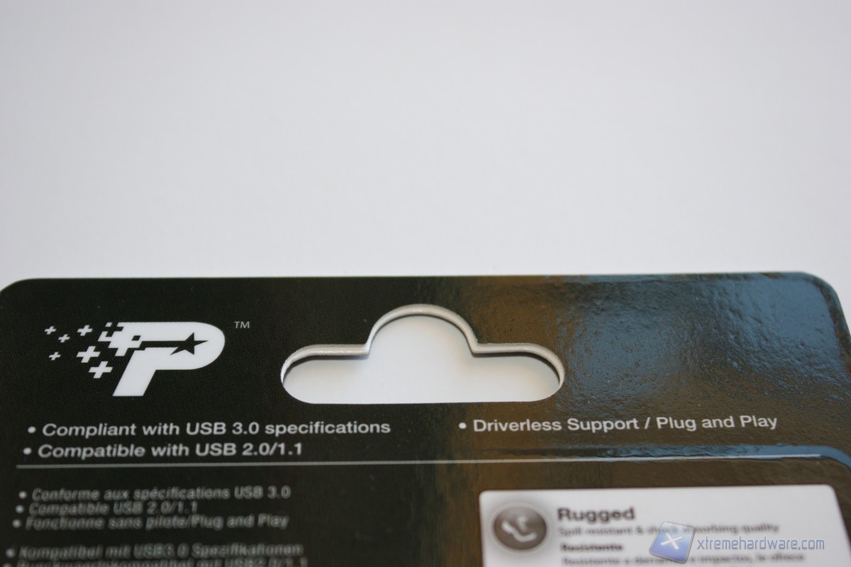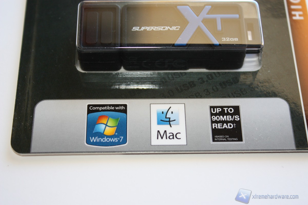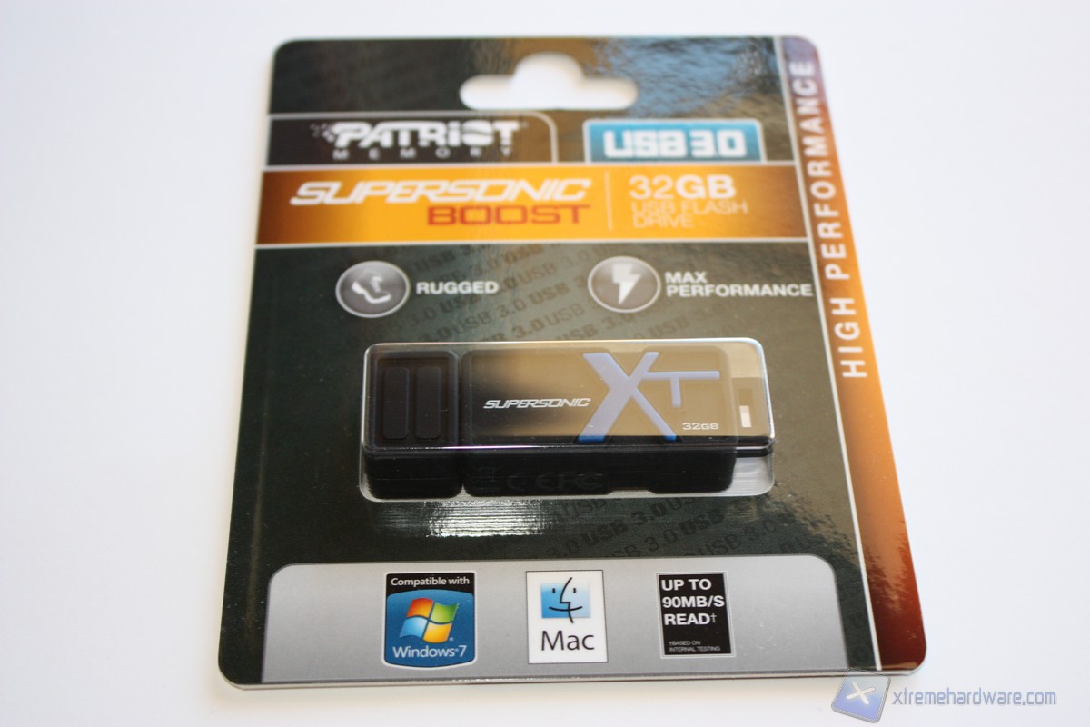 La confezione della Patriot Supersonic Boost XT da 32GB è realizzata in cartoncino leggero con un apertura in plastica trasparente che permette di osservare da vicino il prodotto in essa contenuto. La confezione è caratterizzata da una colorazione nera che predomina sul'intera confezione. In alto troviamo il logo Patriot e quello USB 3.0; sotti ad esso sono riportati il modello e la capacità della pen drive che in questo caso è di 32GB. Vengono riportate le due principali caratteristiche che sono massime prestazioni e chassis ruvido che ne permette una salda presa ed evita in caso di caduta la possibilità di un malfunzionamento. Nella parte centrale troviamo la parte in plastica trasparente che ci permette di osservare immediatamente il prodotto. Infine vengono riportati i sistemi operativi compatibili e l'avvertimento che tale pen drive è in grado di raggiungere sino a 90 MB/s in lettura.