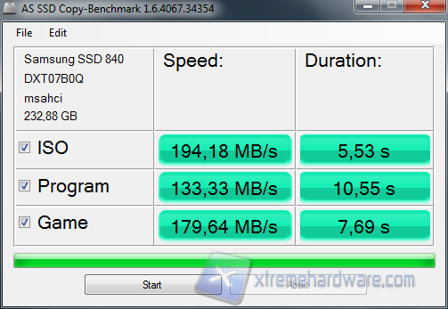 L'840 PRO stacca di quasi 200 punti il modello 840 nel benchmark AS SSD. Oltre alle caratteristiche già evidenziate, nel bemchmark di copia l'840 risulta sempre più veloce, in particolar modo nei file di tipo ISO, evidentemente influenzato dalla maggior velocità di scrittura sequenziale per il modello di punta.