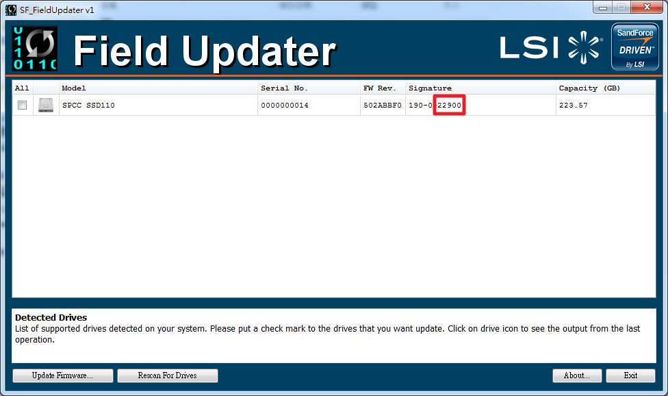 Per prima cosa occorre procedere al lancio del programma con il consueto doppio click sul file SSD FieldUpdater.exe, che appena si avvia procede alla scansione delle unità SSD installate. Si procede alla selezione del drive con il quale si vuole procedere all'upgrade e con il cliccare sul tasto Update Firmware che aprirà un'altra finestra che ci permetterà di selezionare il firmware da installare.